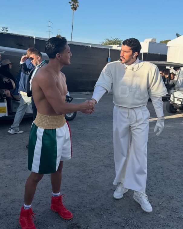 Junto al puertorriqueño Xander Zayas, el joven invicto simuló un combate mientras sonaba “Tití Me Preguntó”, en un guiño al pugilismo como pilar de la cultura latina.