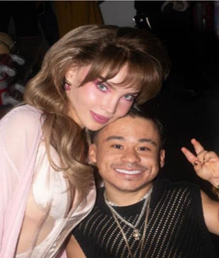 El exfinalista de La Casa de los Famosos México llegó con un enorme arreglo de flores en tonos rosados, detalle que emocionó a la cantante, quien incluso lo cargó con una sonrisa.
