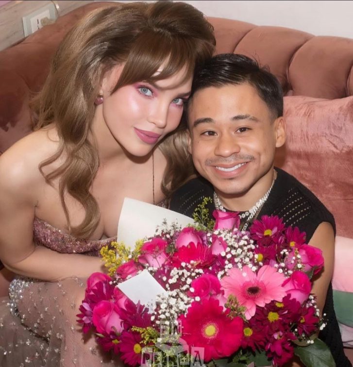 El exfinalista de La Casa de los Famosos México llegó con un enorme arreglo de flores en tonos rosados, detalle que emocionó a la cantante, quien incluso lo cargó con una sonrisa.