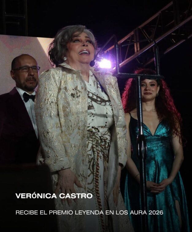 La gran Verónica Castro lucio bella a sus 73 años, al recibir el Premio Leyenda de manos de Eugenio Derbez, este emotivo momento ocurrió durante la tercera edición de los Premios Aura en la Ciudad de México, donde se reconoció su destacada trayectoria de 60 años en la industria del entretenimiento.